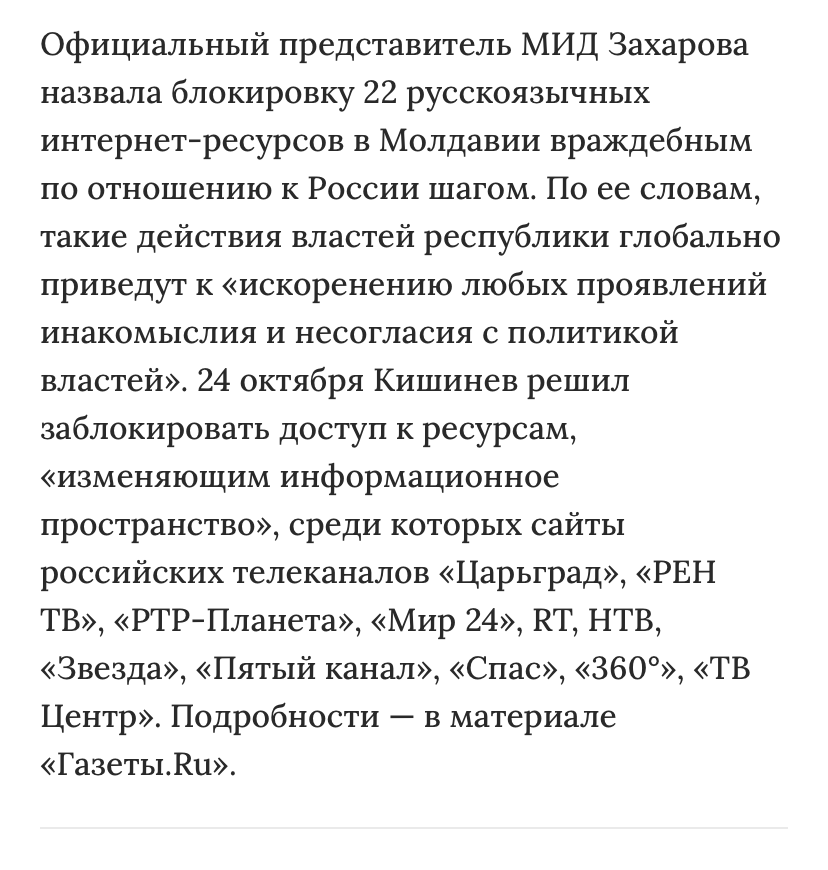 Вот и Молдавия прикрыла рос. г-но интернет ресурсы, и у российских коллег истерика))) телеканалы, думаю, уже давно прикрыты. Или нет?)))