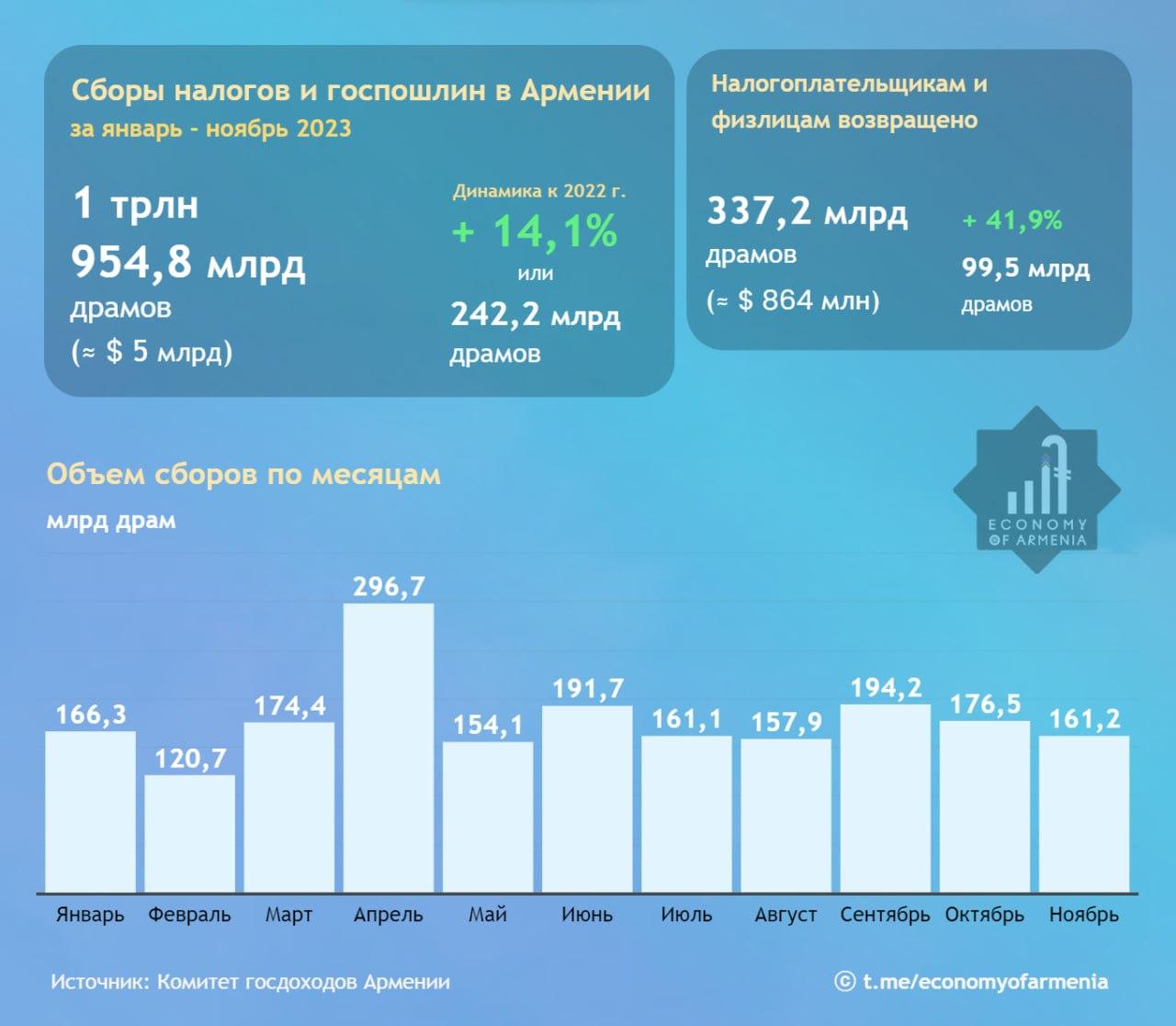 Порядка $5 млрд налогов и госпошлин поступило в бюджет Армении за 11 месяцев 2023 года