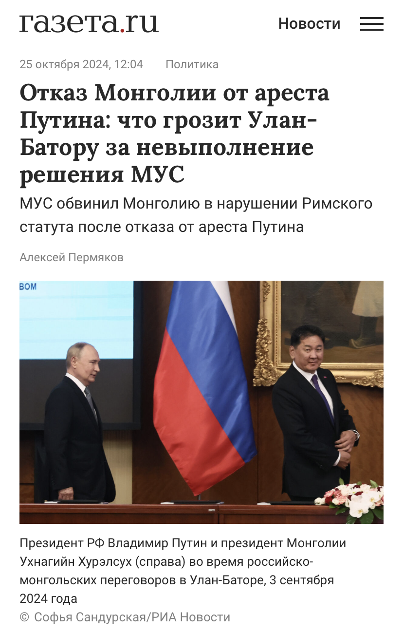 Тут неоднократно мы задавались вопросом - можно ли состоять в МУСе и в то же самое время не выполнять его требования? Например, не арестовывать Путина во время его визита. Тут вроде ответили однозначно: НЕТ, нельзя. Короче, никакие специальные двусторонние договора или отдельные специальные документы НЕ могут считаться основанием для невыполнения требований МУСа. Монголию 100% накажут.