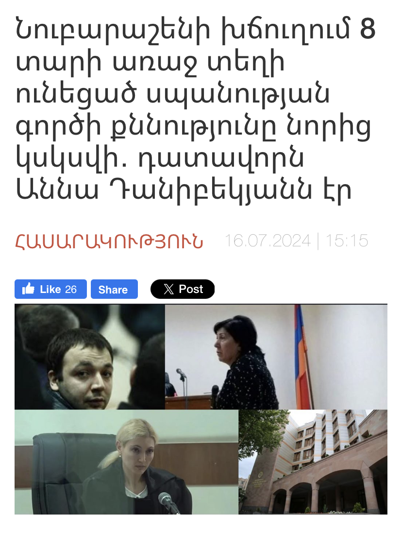 А это - ещё одно проваленное Анной Данибекян дело 8-летней давности, которое она растянула на годы. 5-6 хулиганов избили до смерти сделавшего им замечание из-за нарушения ПДД водителя, а также нанесли телесные повреждения его матери, которая в это время тоже находилась в машине. Убийство произошло ещё в 2016-ом. Слава Богу, следствие по этому делу будет возобновлено, но Анна Данибкян своими растягиваниями слушаний уже нанесла большой вред правосудию. Стратегия что тут, что с делом Кочаряна одна и та же - растянуть процесс по максимуму, пока все сроки не истекут.