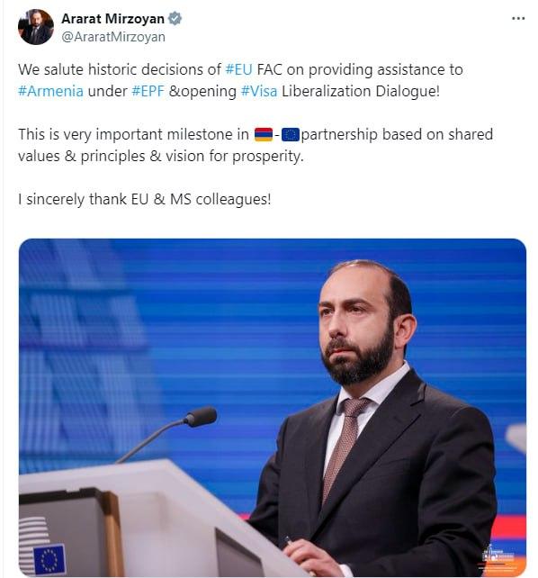🇦🇲🇪🇺 Приветствуем исторические решения, принятые ЕС на уровне министров иностранных дел, об оказании Армении поддержки в рамках Европейского фонда мира и начала диалога по либерализации визового режима.