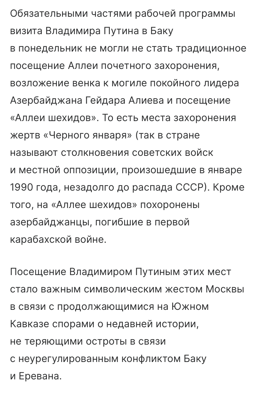 Как он сказал - это самые важные пункты, которые мы на данном этапе должны зафиксировать.  Азербайджан первый пункт устраивает, второй пункт даром не нужен, третий - только, в его интерпритации,"зангезурский коридор" под контролем русских - проходной русско- азеротурецкий караван сарай, т.е.