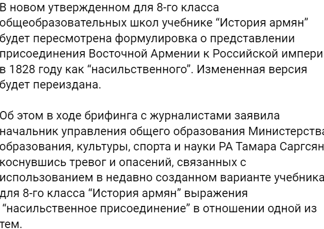 Тогда, я, серьезно, не понимаю  резона этого дискурса , чего авторы этого тезиса добиваются:  признания права  Ирана на  Восточную  Армению или захват (аннексию)  Россией "независимой"  Восточной Армении.   Если не трудно, поясните, что они пытаются донести до общества( учеников, в данном случае), как вы сами это понимаете и обосновываете их точку зрения?