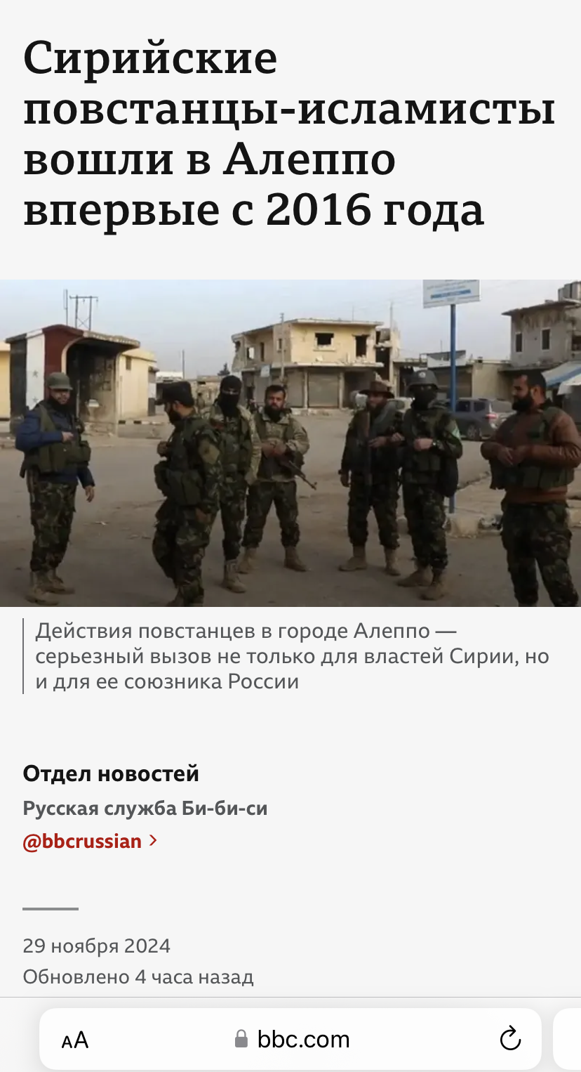 Очень жаль Сирию. Эксперты говорят, что  Асад без согласования прилетел в  Москву, уже вторые сутки просит встречи с  Путиным, а тот его не принимает.  Если, это правда, то происходящее - катастрофа для  Сирии, уже, не говорю о судьбе наших армян.