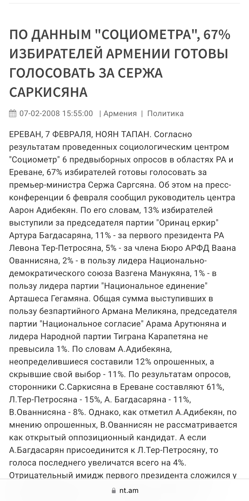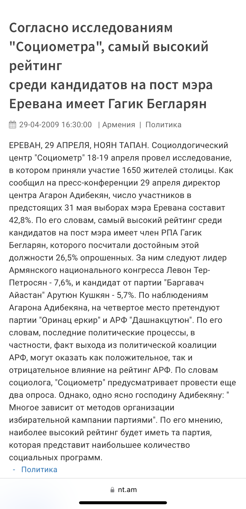 Оказыцца даже в Ереване Сержио имеет подавляющее преимущество перед ЛТП. Но самый шедевр заключается во фразе,касающейся выборов мэра Еревана:оказывается наивный Адибекян делает прогноз,что наибольший рейтинг будет иметь та партия,которая представит наибольшее количество соц программ,а не та,которая инчкан кузенк,энканел кэхэпенк.Хотяяяя,если читать фразу Адибекяна между строк,ведь 5тыс драм это тоже,соц программа,и кто больше этих соц программ раздаст лехторату,того и манументи пати мичин,анмаhакан тунэ кэлины
