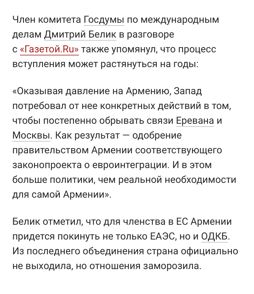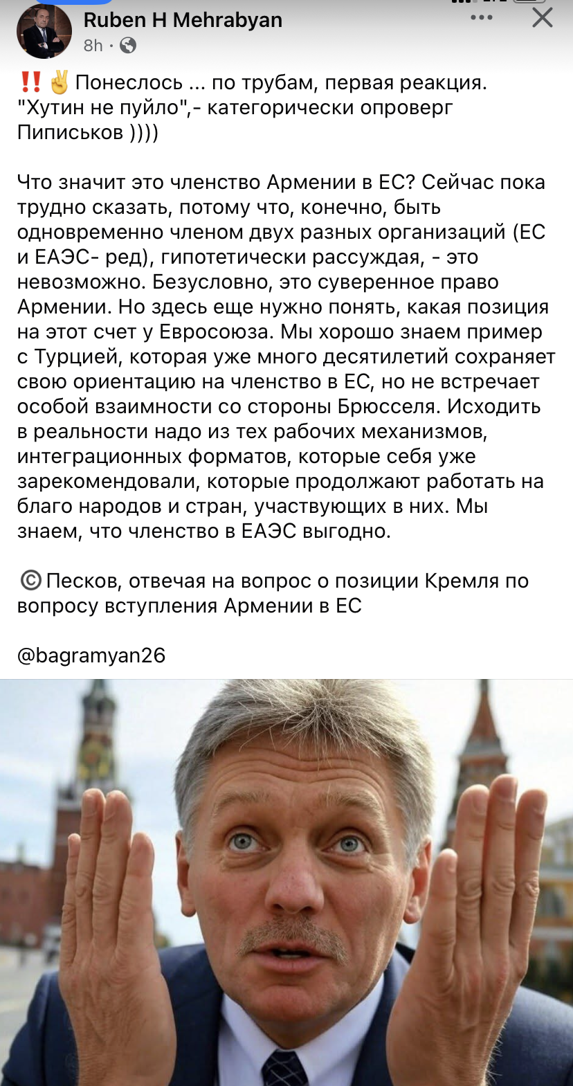 А шо это они от имени ЕАЭС выступают?Они даже не председательствуют сейчас.Может быть казахи и кыргызы не против нашего вступления в ЕС.Может казахи готовы нам дешевле России энергоносители продавать.А по поводу ОДКБ,надо Армении от имени ОДКБ сделать заявление:почему Россия,как член ОДКБ не провела консультацию с членами ОДКБ перед вторжением в Украину.Есть ли такой пункт в ОДКБ,по которому можно исключить члена из ОДКБ за агрессию против другой страны?Кэтнериц эт ОДКБен питы hаненк.Эненц,вор мез дер питы кашарк тан вор менк дурс ганк эд тегиц
