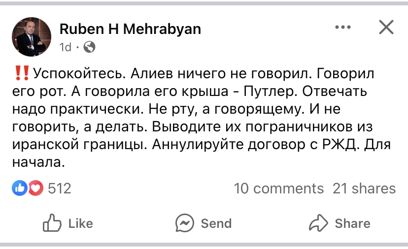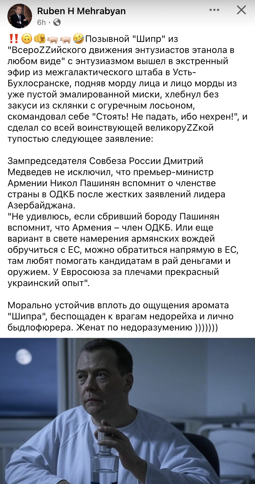 Или Алиев принимает посредничество России в сегодняшней ситуации? Или у них сложилось впечатление, что Путин так задет словами Алиева относительно крушения гражданского самолета, что он намерен отправить войска из Дагестана в Азербайджан, ждет «обращения» Пашиняна?». Медведев «подсказал»?