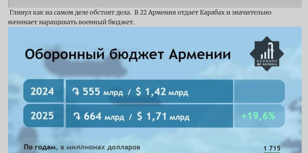 Глянул как на самом деле обстоят дела.  В 22 Армения отдает Карабах и значительно начинает наращивать военный бюджет. 00Tg876rdFAutD86fKxqh5HqIffI0G-FkuHXBtJGCoqkPe42YltbnwLrpWNMzOTGrzf8sINcM51JvpFucA860quO.thumb.jpg.5fa9970f654563bd6032d5c88fe8a086.jpg