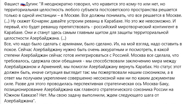 Знаешь что самое грустное? Самое грустное - это то, что прочитает среднестатистический избиратель Варданика или зомби-последователь Бзге слова Дугина о том, как Россия «принесла в жертву союзника» ради получения выгоды от Азербайджана, и скажет «А де hето инч? Авели лав а руснери hет линенq qaн թուրքերի так линенq». Прокладки Захаровой неисправимы.