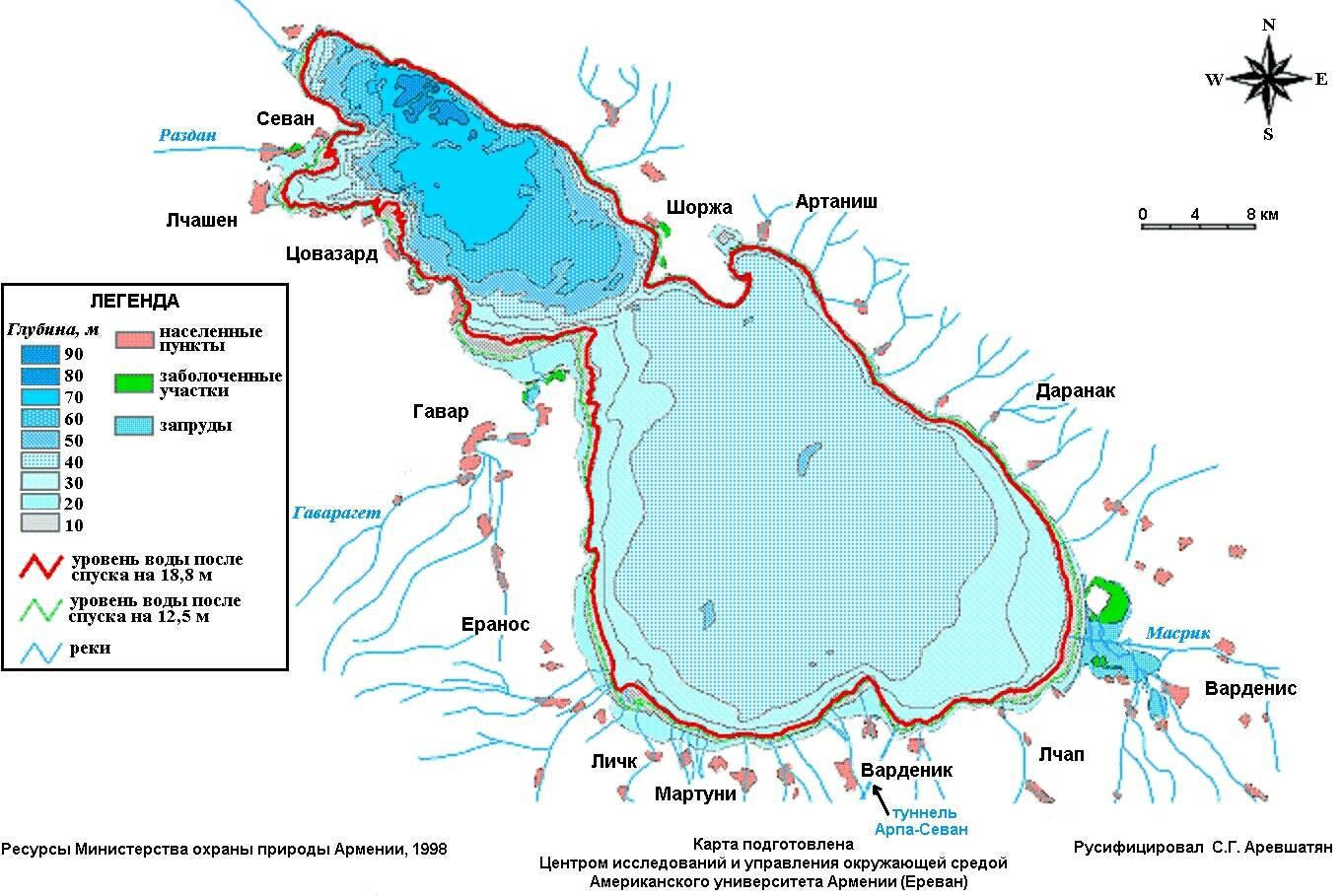 При этом ширина пролива между Большим и Малым Севаном довольно скромная: около 5,.5 км. Как и глубина - порядка 30 м.