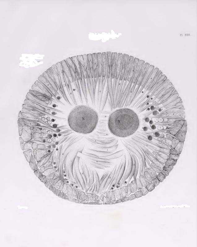 похоже также на разрез органа или простейшего организма, но N в ядрах позволяет думать, что это нуклеос- ядро, возможно так представляли тогда слияние двух клеток  (два ядра) или просто двуядерная клетка (бывают такие при патологиях).